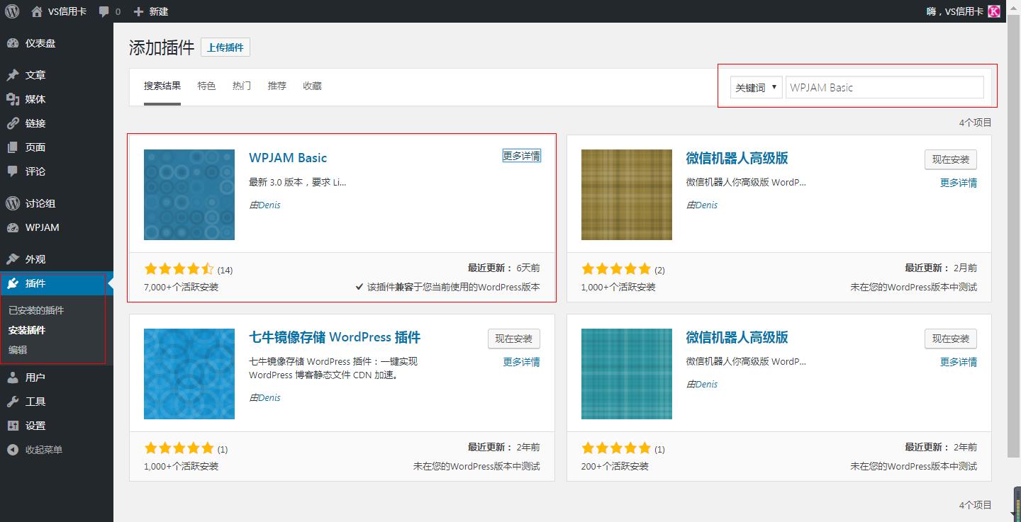 第二步:在WordPress后台插件选项搜索并安装启用 WPJAM Basic 插件;
