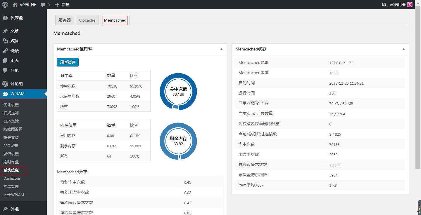 在这里我们可以查看到我们WordPress网站配置Memcached缓存加速后的命中次数以及其它相关数据,现在WordPress的Memcached缓存加速已经配置成功了。