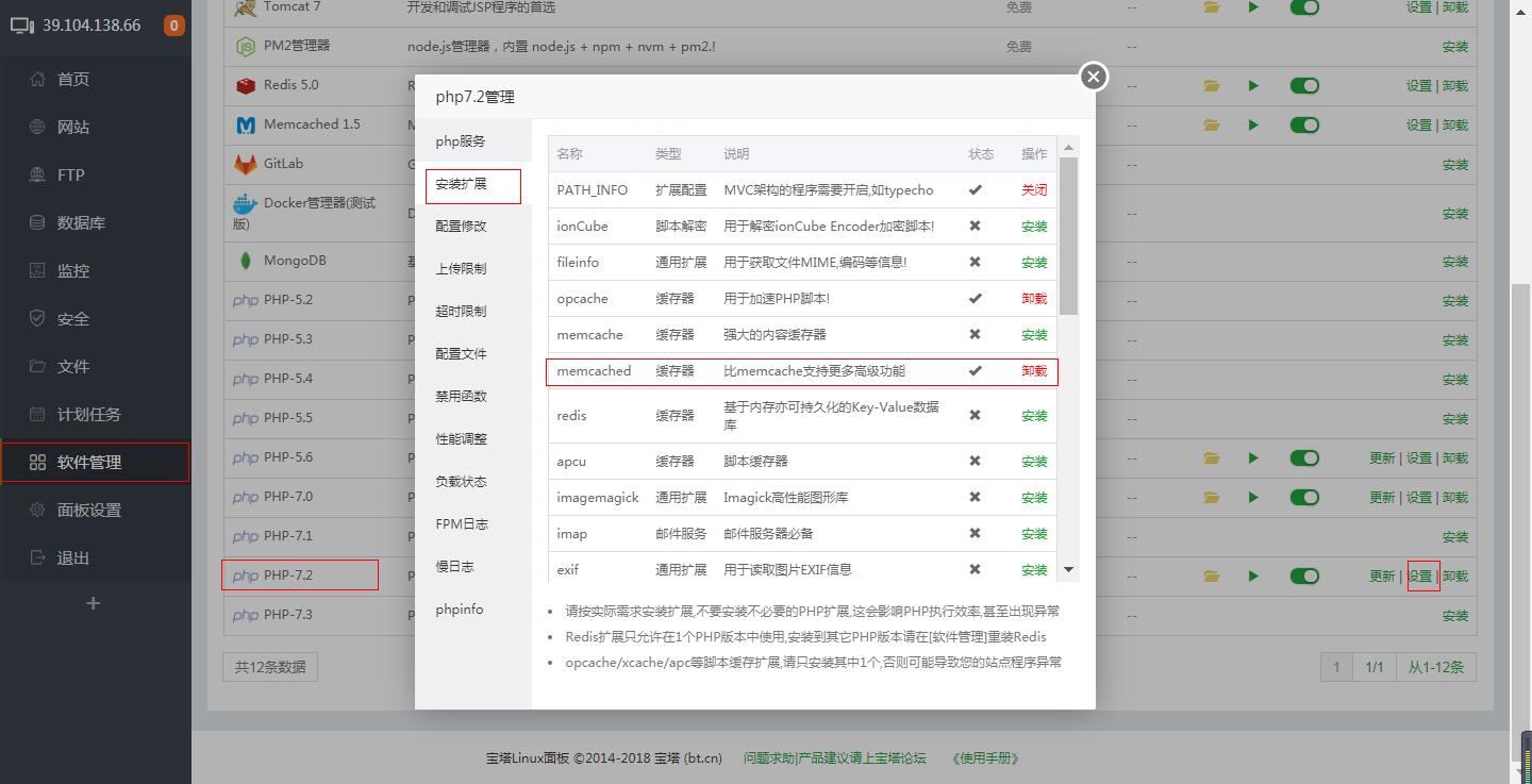 第一步:Linux服务器的Bt宝塔控制面板将Memcached扩展安装好;(如上图)