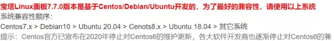 为了稳定,我一直使用的都是centos7版本的系统,这里不推荐centos6了,如宝塔官方所说,centos官方都已经停止维护了,所以新装机器就不要选择老版本了。