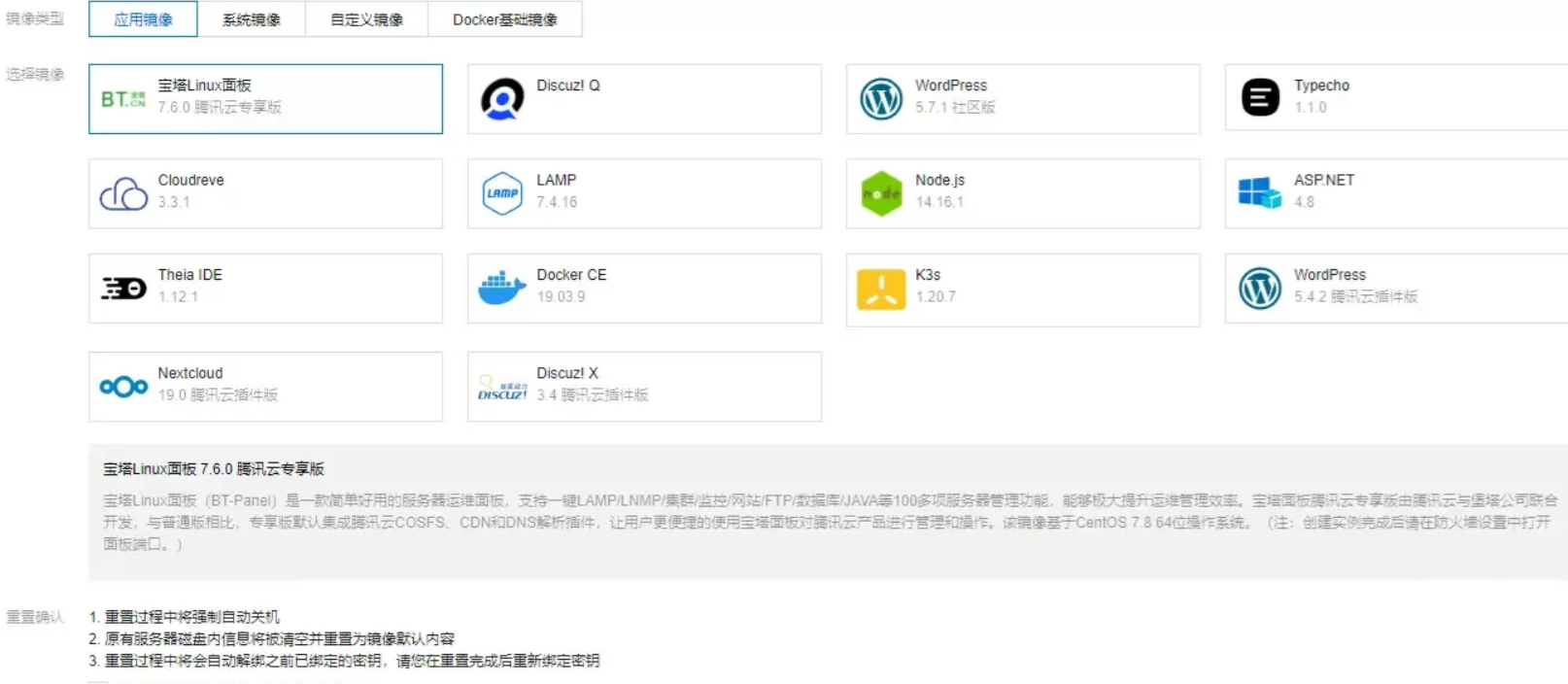除了系统之外,咱们还可以选择需要的应用环境,比如说,低配置的服务器只需要安装wordpress网站,那完全可以选择wordpress社区版本。