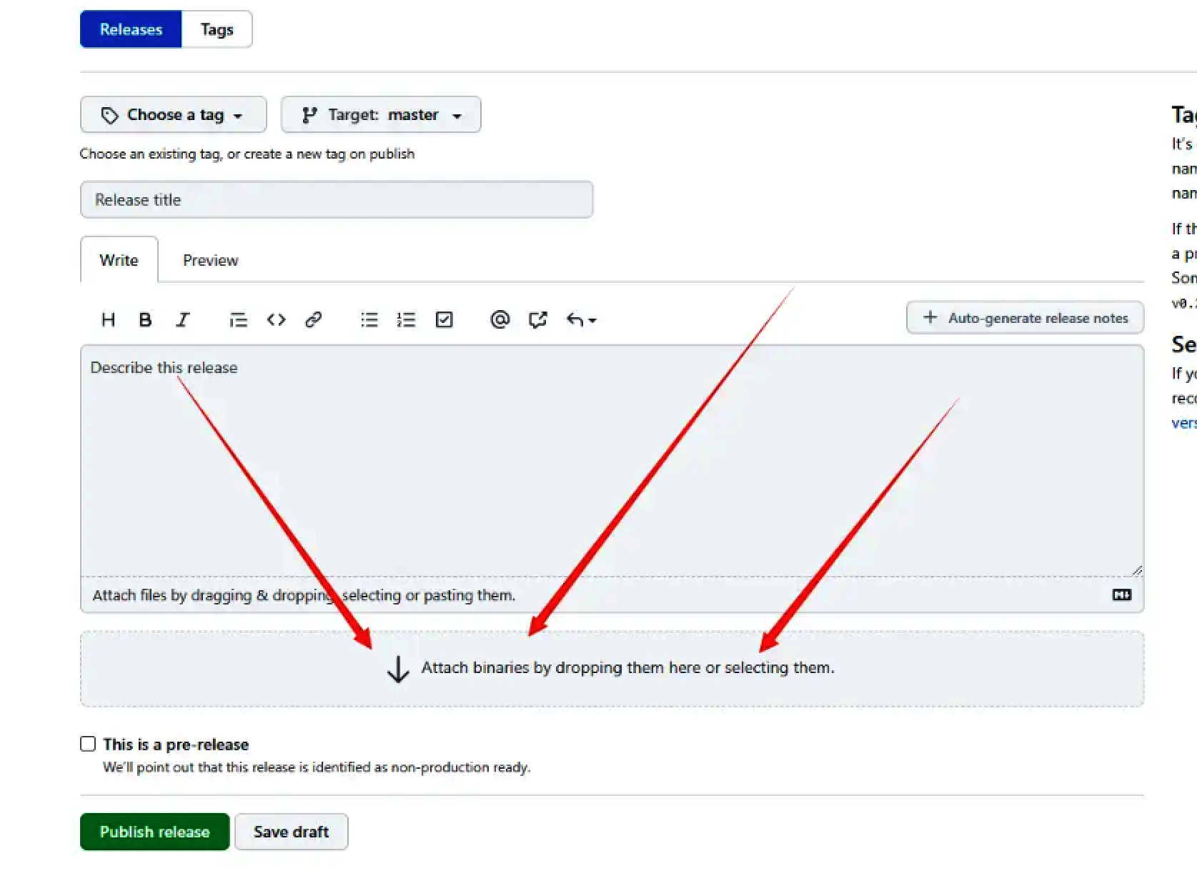 这里咱们选择右侧的 Releases ,之后 create 一个新的标签,随便写一点东西,重要的是我们开始上传文件,点击你需要上传的文件,选中等待它上传完毕就行了。