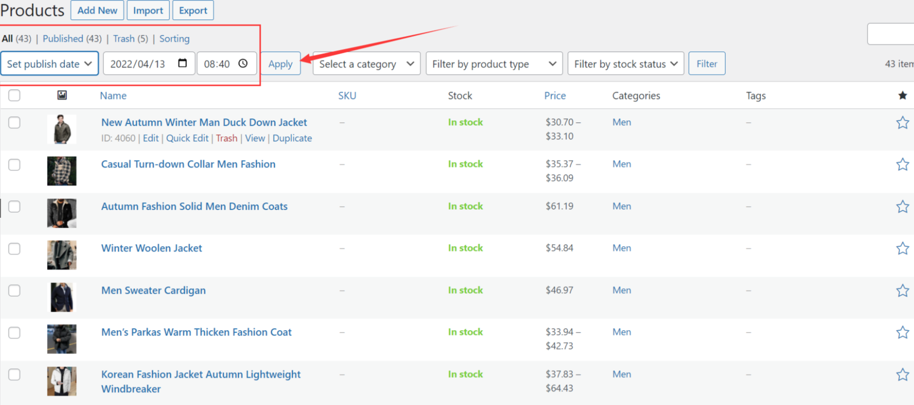 首先安装 “Bulk edit publish date”插件。之后立马启用。