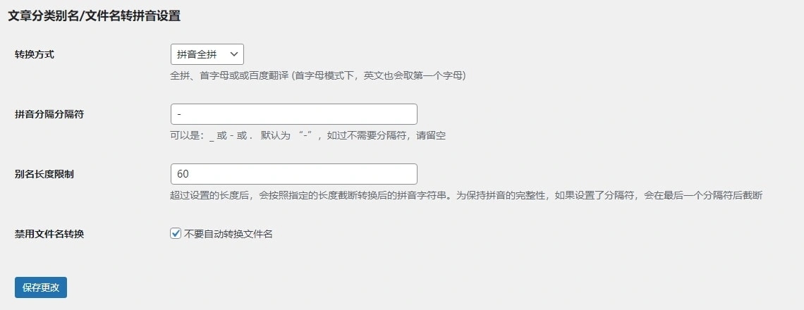 咱们主要说的是 wenprise-pinyin-slug 这个插件,在官方可以找到,后台点击一下就能安装,启用之后界面就是这个样子的。