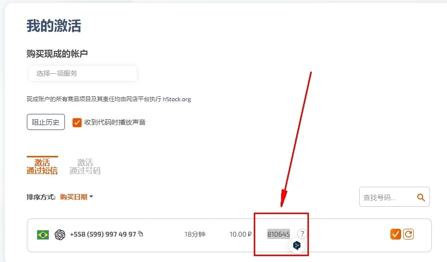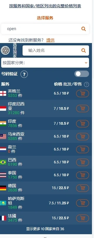 之后我们在左侧找到openai这个服务,选择你钟情的国家手机号就行。