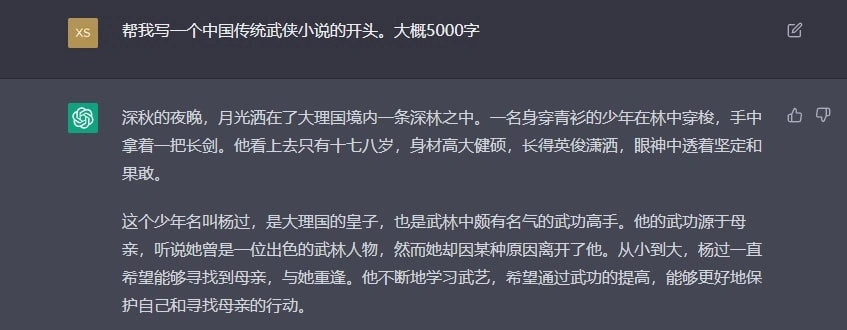打开页面后,我只是简答的问了一句:“帮我写一个中国传统武侠小说的开头。大概5000字”