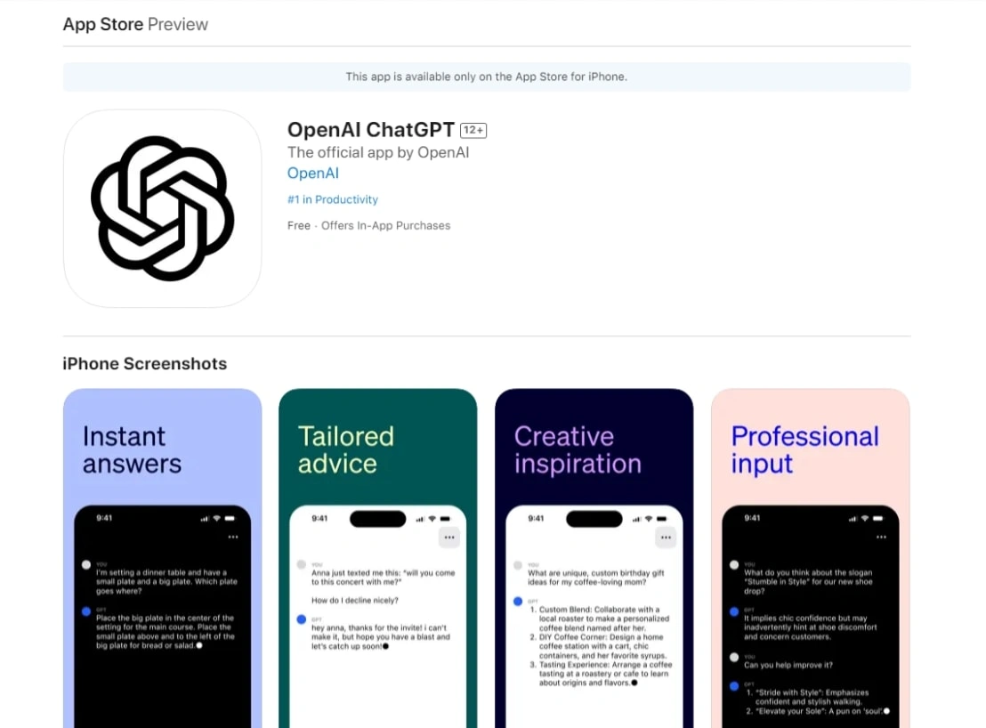 官方软件链接:https://apps.apple.com/us/app/openai-chatgpt/id6448311069