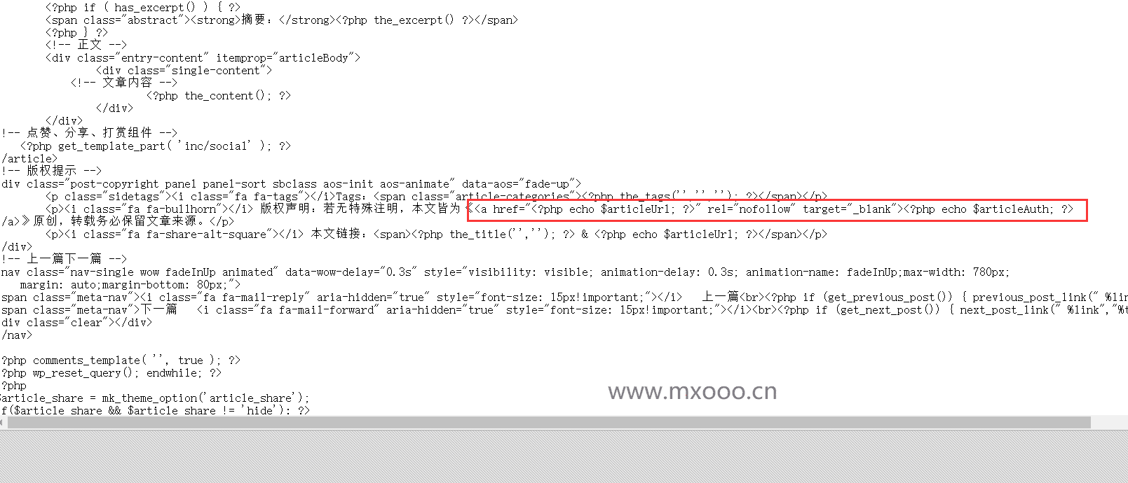 找到上图的地址的地方,然后删除<a>链接里面的所有内容。替换为下面的内容,由于我本站使用的mkblog主题,主题的 functions.php 文件被定义的重写作者url链接的代码,所以如果启用下面的这个代码的话,我这边还需要去 functions.php 中注释掉重写作者url的代码。