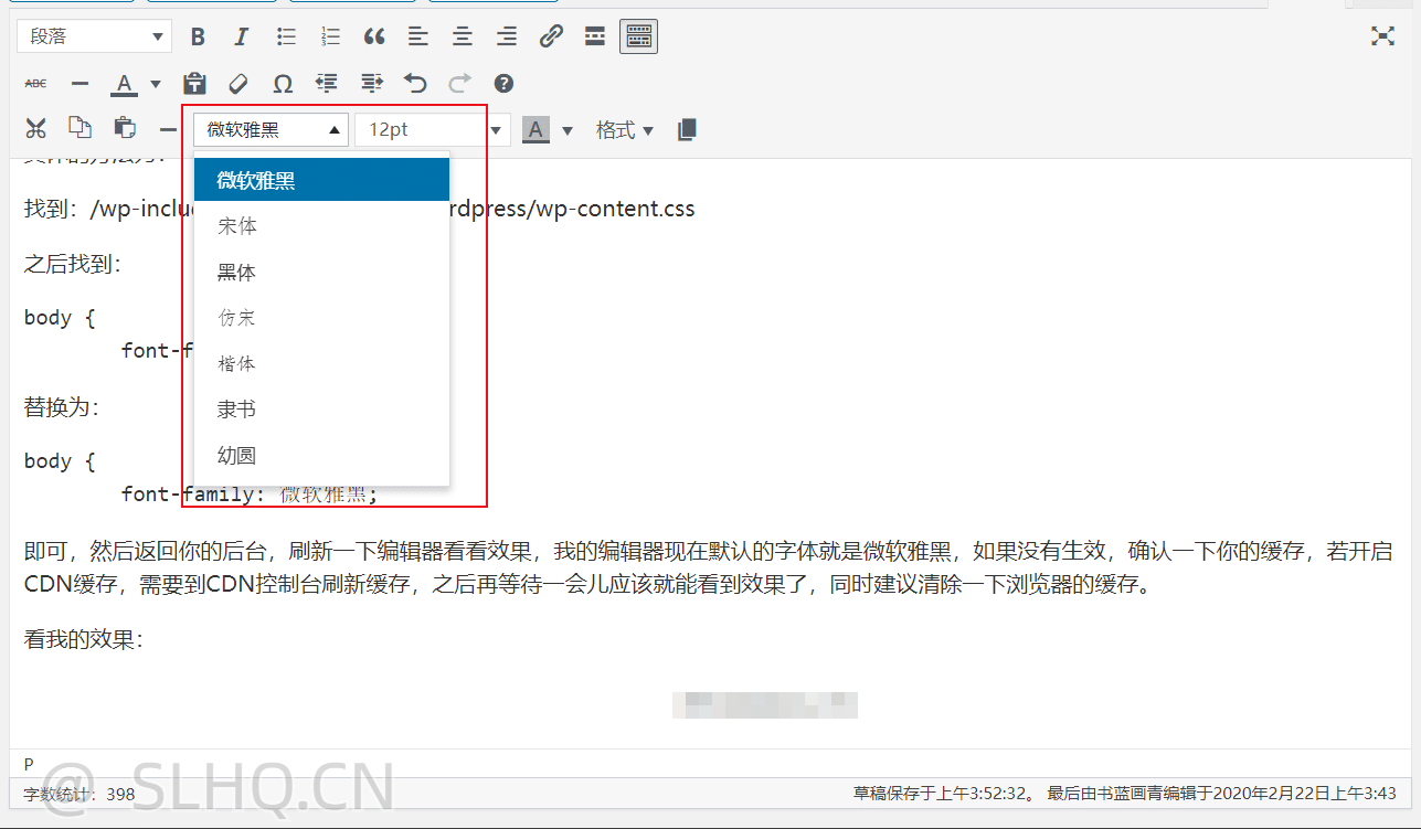 即可,然后返回你的后台,刷新一下编辑器看看效果,我的编辑器现在默认的字体就是微软雅黑,如果没有生效,确认一下你的缓存,若开启CDN缓存,需要到CDN控制台刷新缓存,之后再等待一会儿应该就能看到效果了,同时建议清除一下浏览器的缓存。