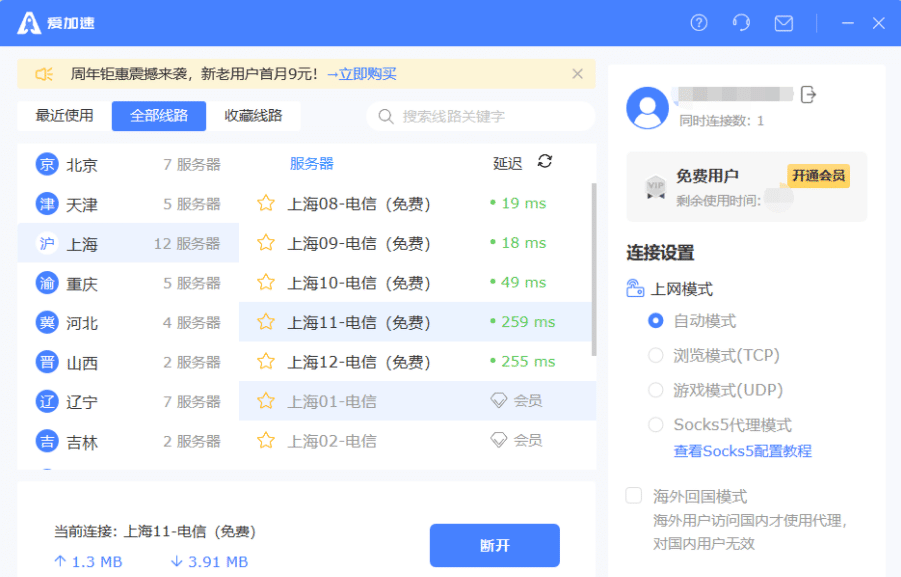 软件挺适合隐藏自己真实IP时使用,当然换种链接方式也能作为游戏加速工具使用了。比如我最喜欢链接北京地区服务器之后到CF的北部大区玩游戏,比我直连要快,延迟也低很多。