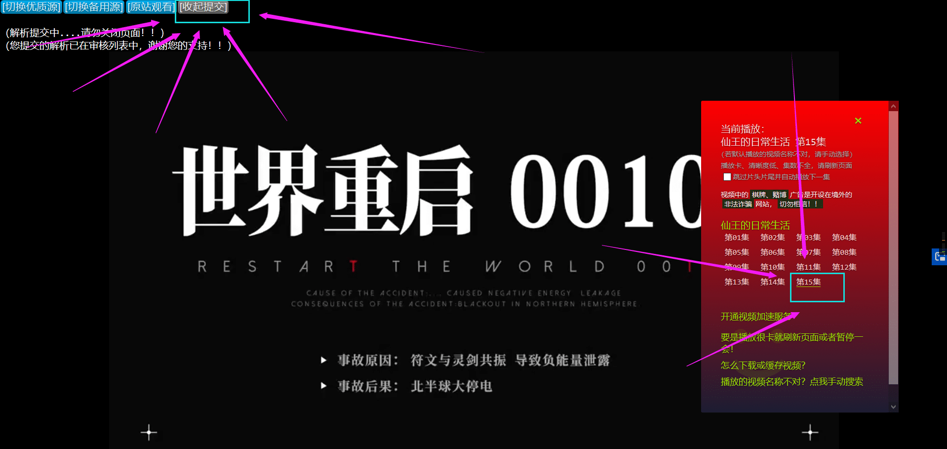 总共有两种方法观看“仙王”,一种是右边的红色那块,直接搜索资源名称,然后选择第几集就能播放。