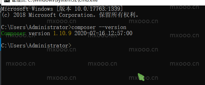 弹出的dos命令框中输入“composer --version”按回车键,之后会出来一串的绿色字符,这就代表已经安装成功了。