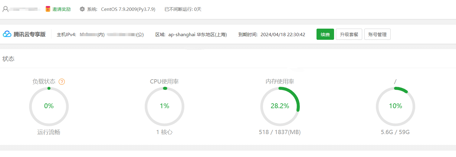 之后再次打开页面,发现整个面板都获取不了服务器的状态信息了,包括运行了多少天,多少流量等。。。