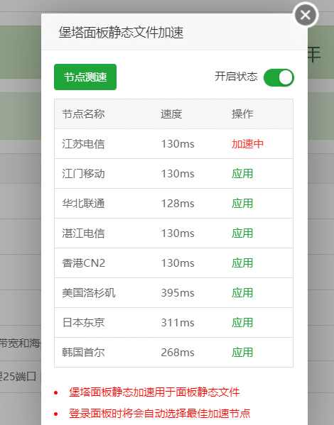 突发奇想的想试一下宝塔面板推出的“堡塔面板静态文件加速”这个插件。之后我就安装了,到设置里面打开并选择了一个比较合适的节点进行加速。